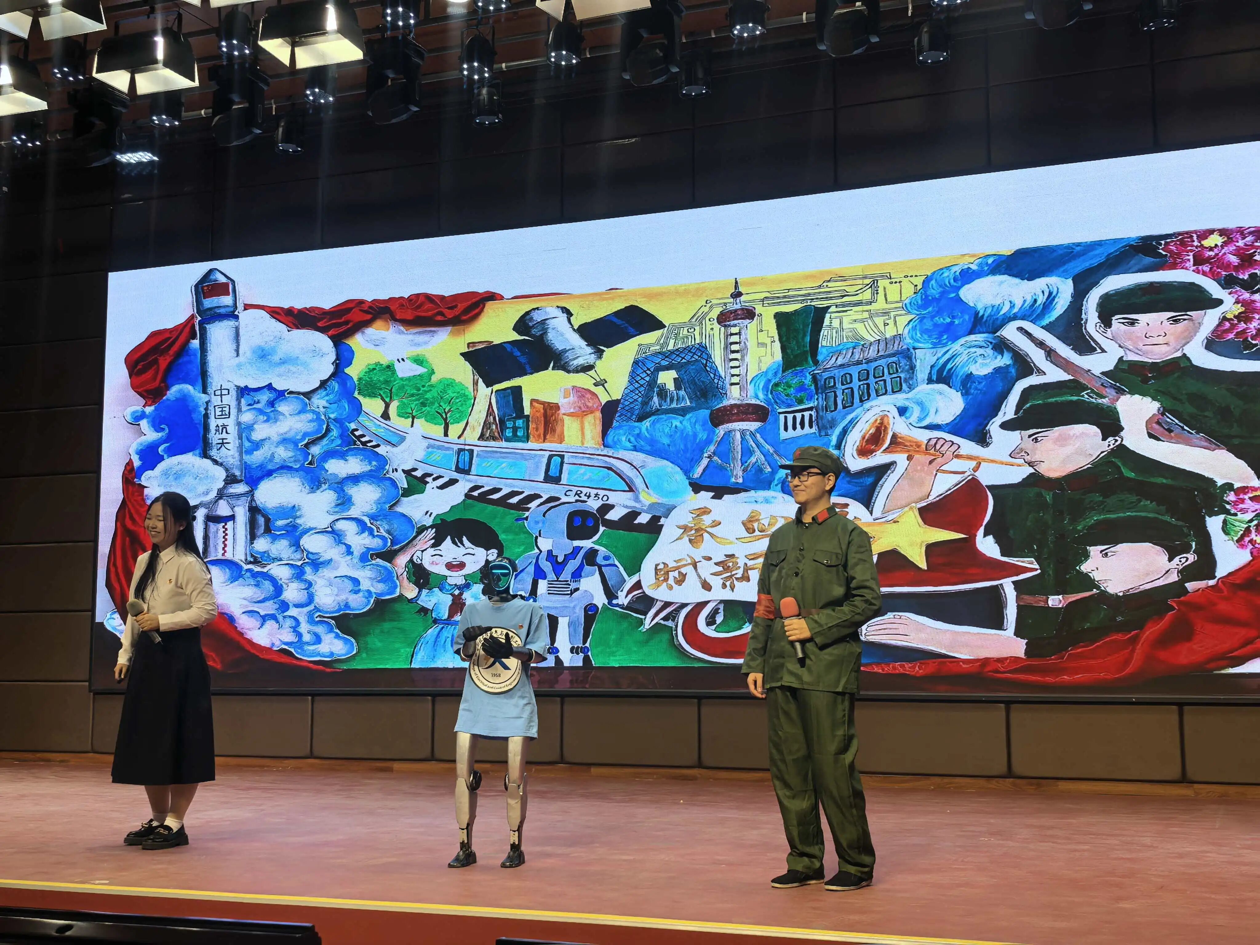该作品将红色基因传承与当代发展主题有机融合:画面中,军人形象象征着红色精神的赓续延续;印有“中国航天”标识的火箭、CR450高速列车、卫星与智能机器人等元素,集中展现了我国在航天、交通与科技等领域取得的重大成就;东方明珠与现代建筑群等城市意象,与和平鸽、盛放的牡丹相互映衬,喻示国家的繁荣发展与和平稳定。作品以立体化的艺术语言,将“红色血脉传承”与“新时代创新赋能”深刻结合,诠释了家国发展进程中精神延续与时代奋进的核心内涵。